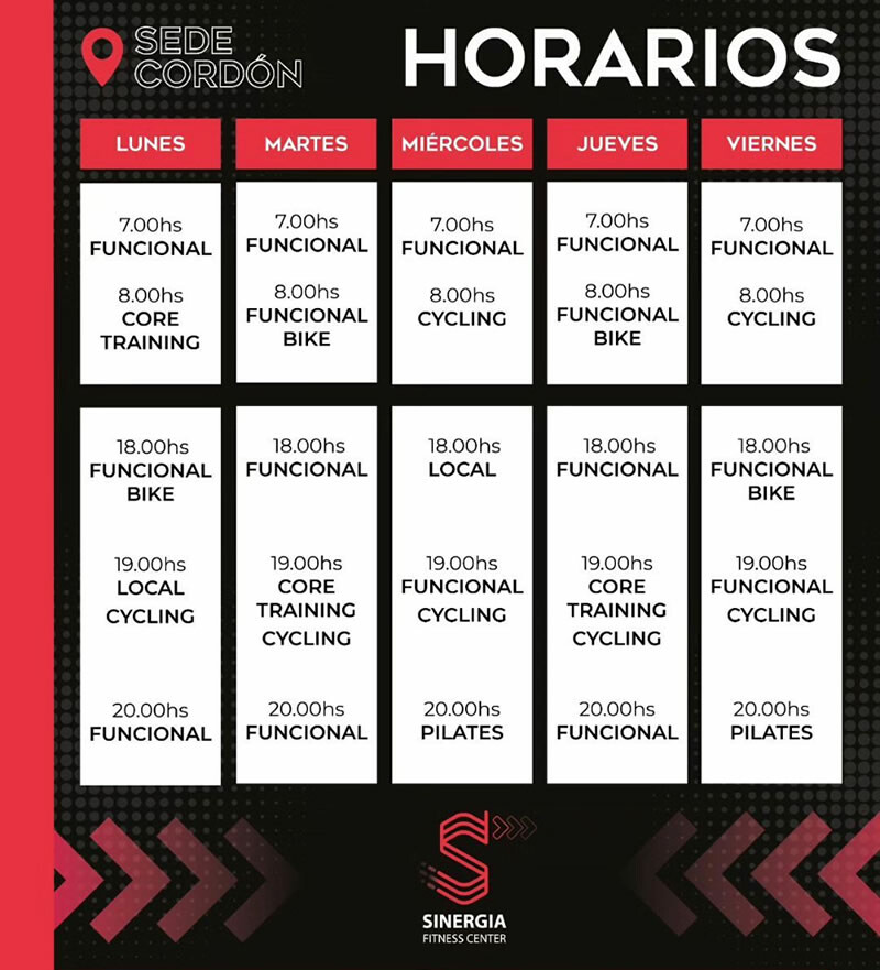 En Sinergia Fitness Center (Cordón) se ofrecen actividades como Gimnasia Localizada, Entrenamiento funcional, Pilates, Indoor Bike, Spinning y Musculación.